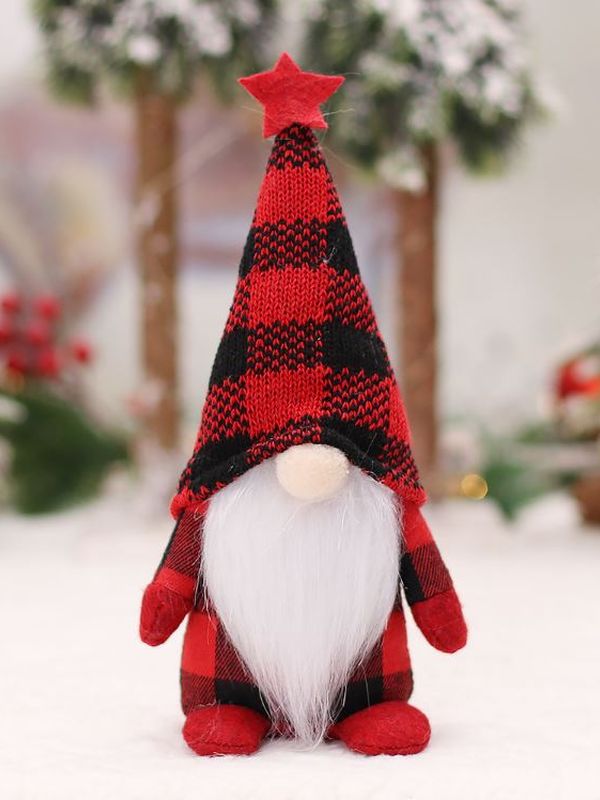 This medium-sized gnome features on-trend black and red Buffalo plaid print and red felt trim.