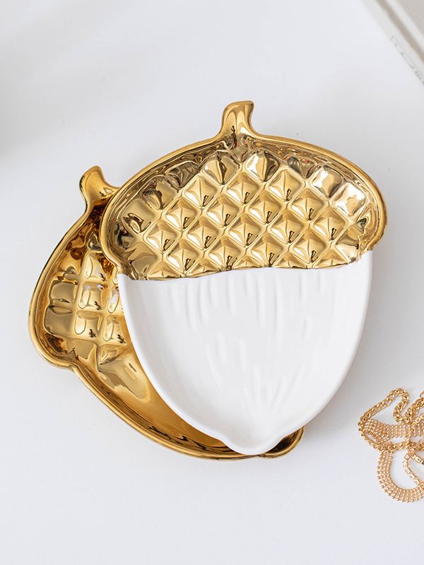 This acorn-shaped ceramic ornament features gold electroplating and is ideal for displaying rings, earrings, and small jewellery items.