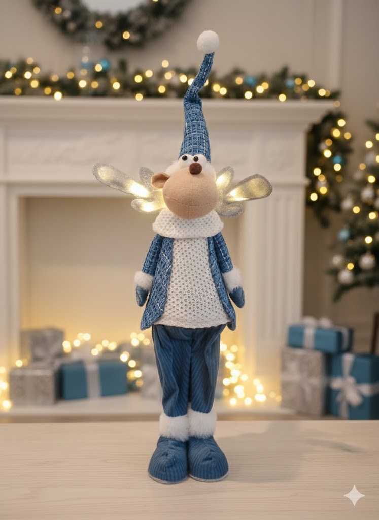 A delightful 60 cm blue-and-white reindeer who twinkles with mischief, lighting the way with its glowing LED antlers and holiday cheer.