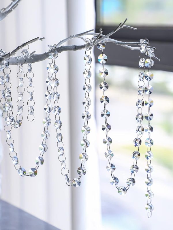 This clear crystal glass garland features octagonal beads. Sold in one-meter lengths, the strands can be shortened or lengthened, by connecting or disconnecting the metal rings.
