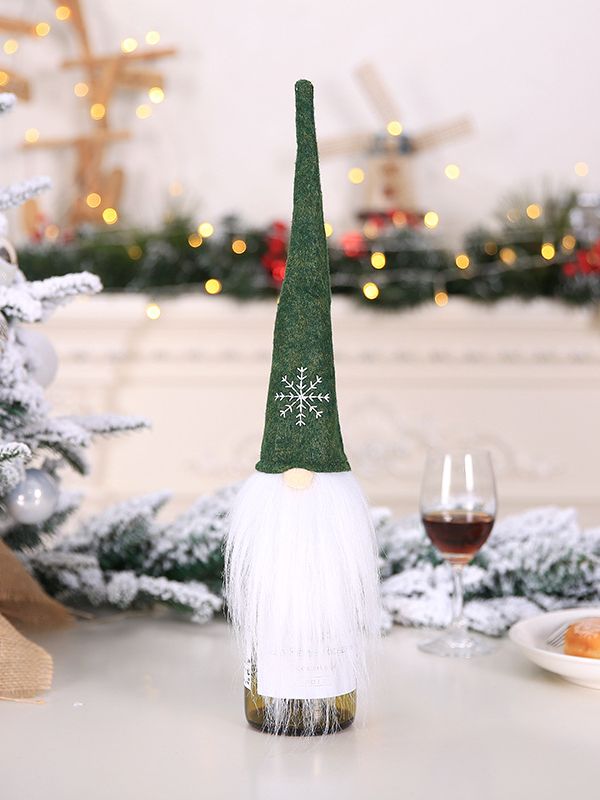 This gnome bottle cover features a felt hat and a long beard. Made to fit standard wine bottles, these covers can be used to dress containers and bottles at your festive table.