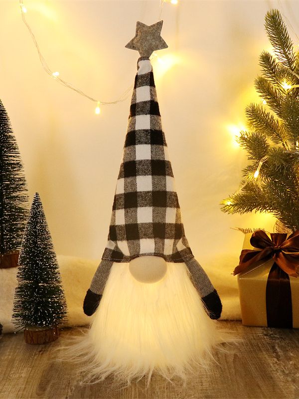 This large gnome features on-trend black and white Buffalo plaid fabric and an imitation fur body that lights up with a warm white LED light. Batteries required AAA x 3.