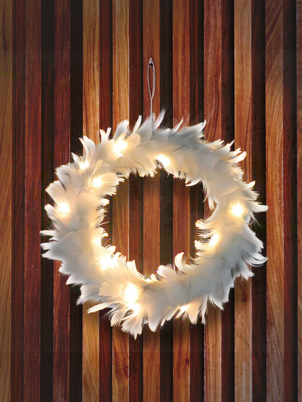 Soft white feathers and warm LED lights combine to create a delicate, glowing wreath perfect for adding elegance to any space.