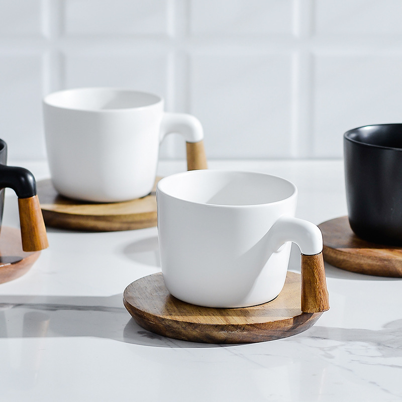 This Nordic-style ceramic cup comes with an Acacia wood saucer and features a matching wooden handle. Perfect for tea and coffee, this set offers both style and comfort.