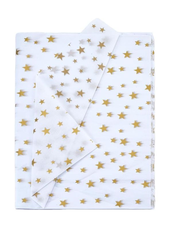 These high-quality tissue paper sheets feature a gold star print on a white background. Perfect for packaging and gift wrapping, each pack includes ten sheets.