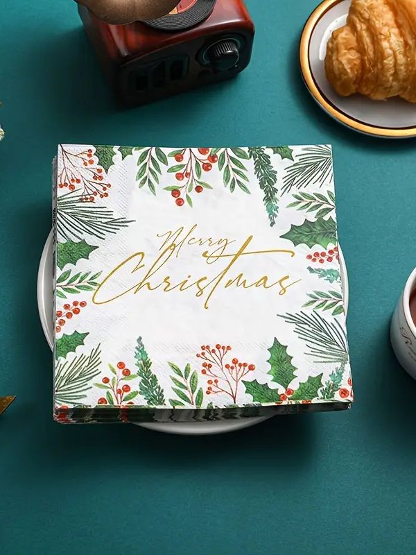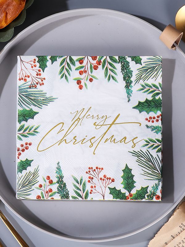 These two-ply paper serviettes feature a Christmas holly design with gold text.
