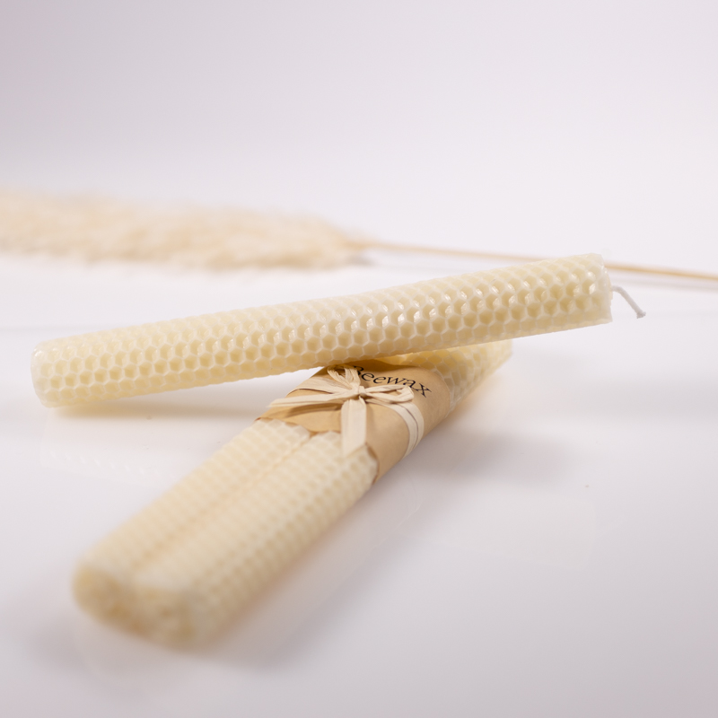 These textured candles are sold in a pair of two and hand-rolled from patterned wax sheets. Contains beeswax and soy wax.