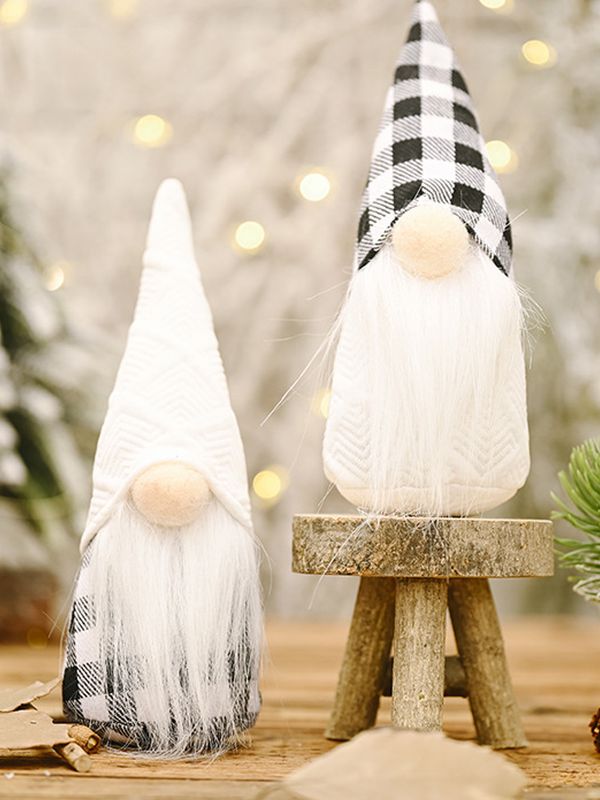 These free-standing gnomes are sold in a pair of two, each featuring black and white plaid fabric detail.