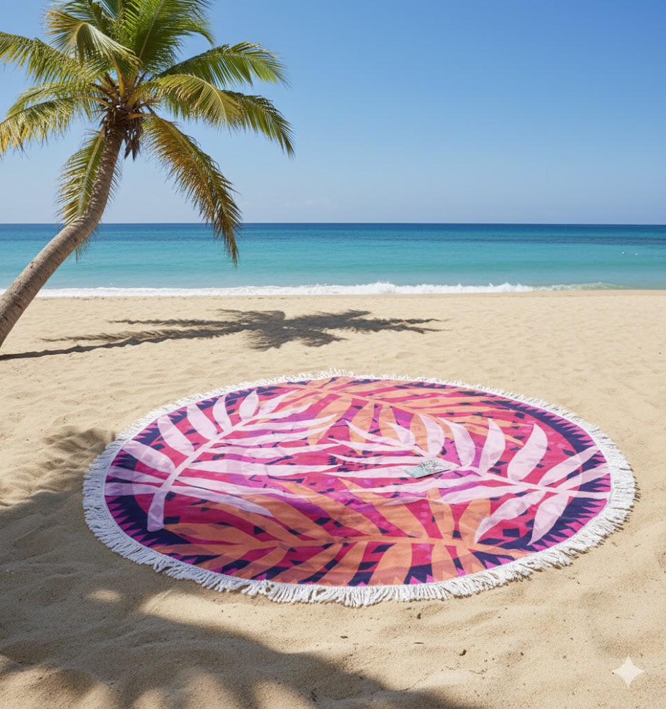 Our eye-catching round towels are made of microfiber which makes them lightweight and super absorbent. Embellished with a white fringe, they are ideal for use around the pool or at the beach. Available in 3 vibrant designs, blue Aztec, pink palm and rainbow they would make an ideal gift for someone special or take them along on your next vacation.