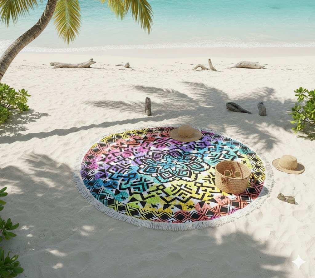 Our eye-catching round towels are made of microfiber which makes them lightweight and super absorbent. Embellished with a white fringe, they are ideal for use around the pool or at the beach. Available in 3 vibrant designs, blue Aztec, pink palm and rainbow they would make an ideal gift for someone special or take them along on your next vacation.