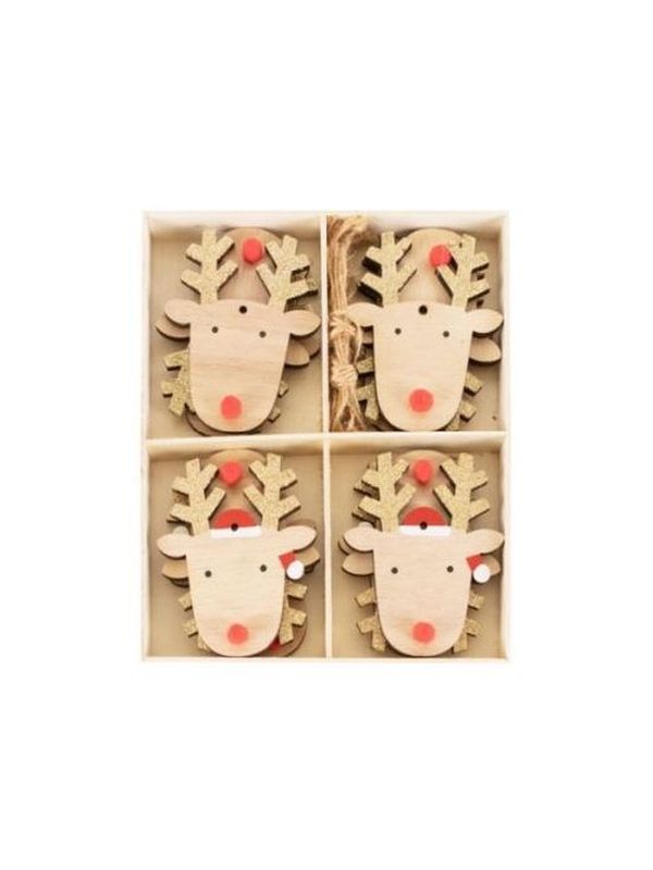 These plywood reindeer pendants feature red pom-pom noses, gold glitter antlers, and hemp rope for hanging. They are presented in a wooden box of twelve and include two designs.