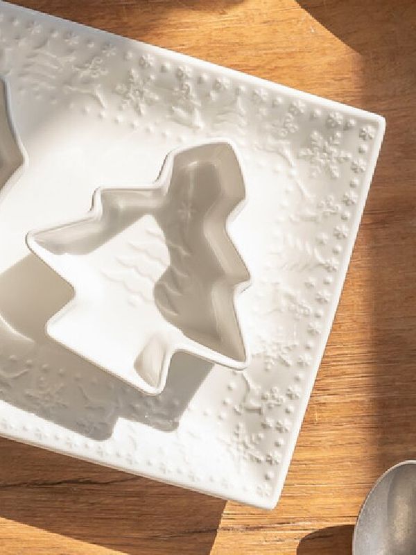 This tree-shaped ceramic plate features embossed detailing and can be used for serving food or displaying trinkets.