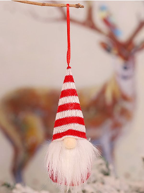This small gnome pendant features a felt body and wool stripe pattern hat.