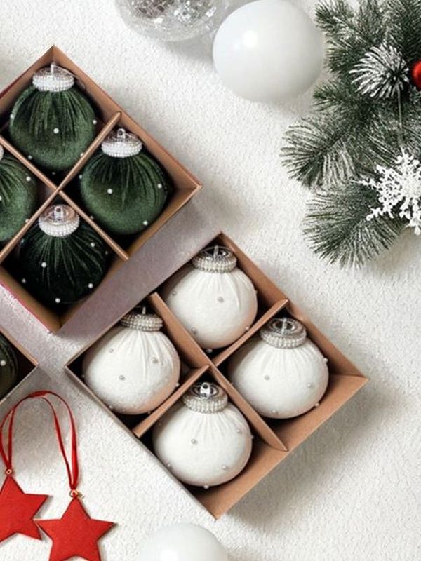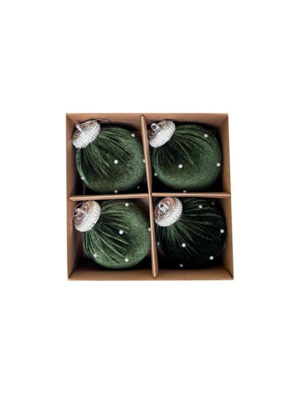 Luxurious velvet-covered baubles are sold in a box of four and feature imitation pearl detail.
