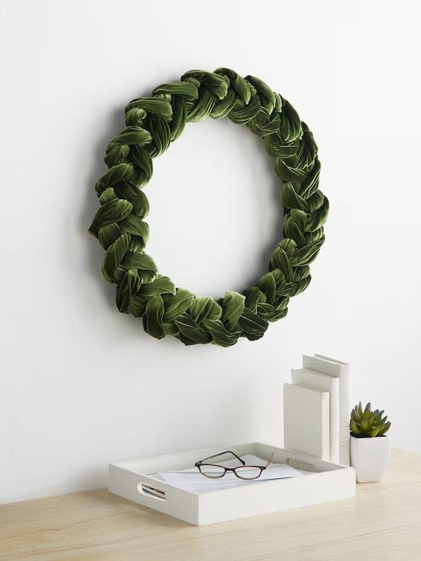Luxurious olive green velvet wreath that adds a soft, sophisticated touch to any décor. Perfect for year-round style or holiday displays.