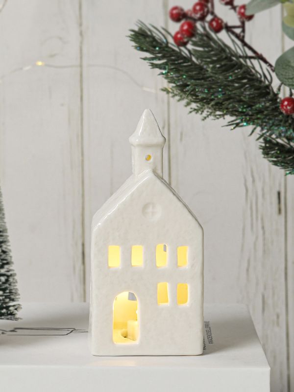 This white ceramic church ornament is illuminated with a warm white LED light. Batteries are included.