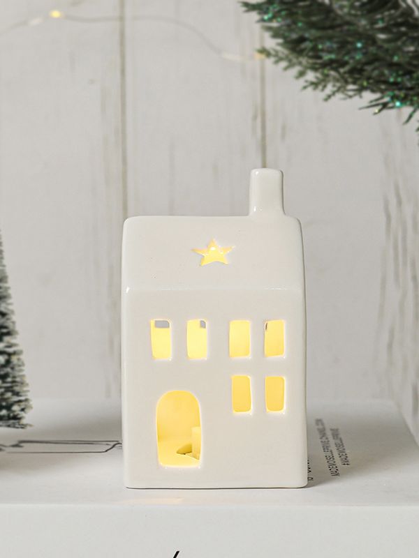 This white ceramic house ornament is illuminated with a warm white LED light. Batteries are included.