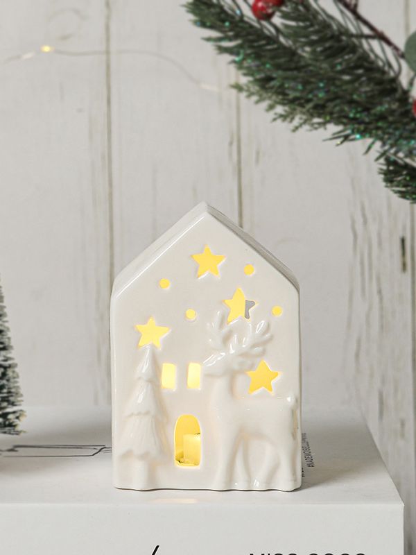 This white ceramic house ornament is illuminated with a warm white LED light. Batteries are included.