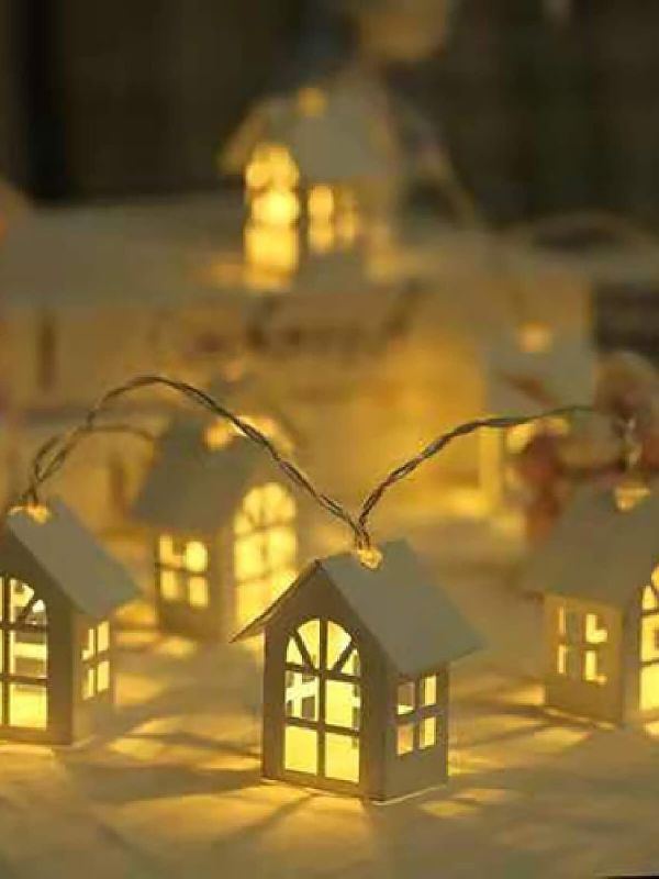This LED light strand features ten plywood houses with warm white lights. Use with 2 x AA batteries (not included).